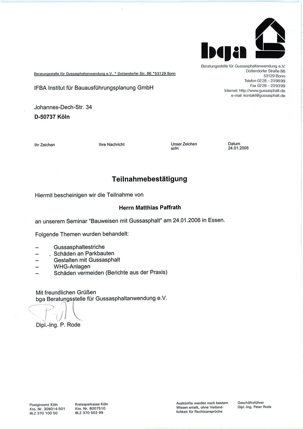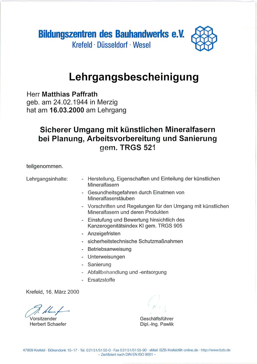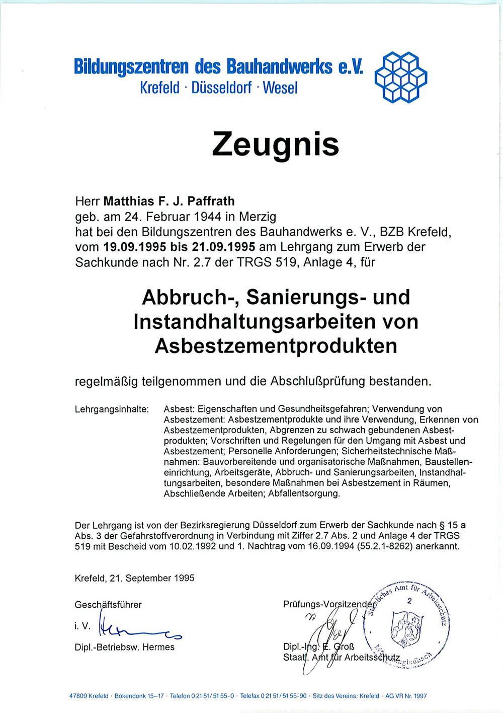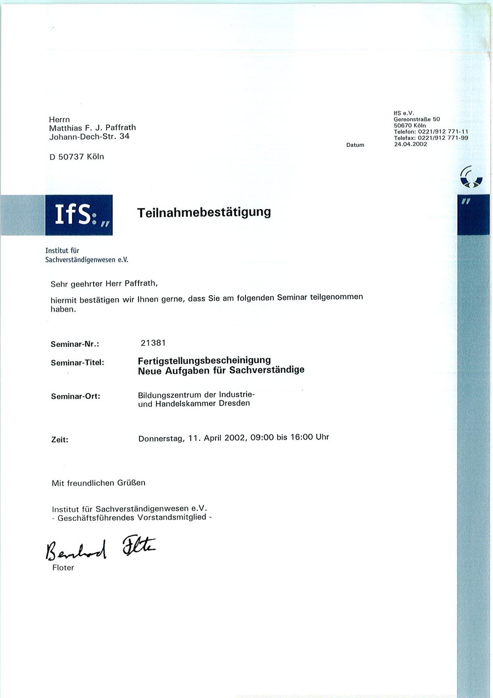 Unterrichtstätigkeit am Gewerbeförderungsinstitut der Handwerkskammer zu Köln |